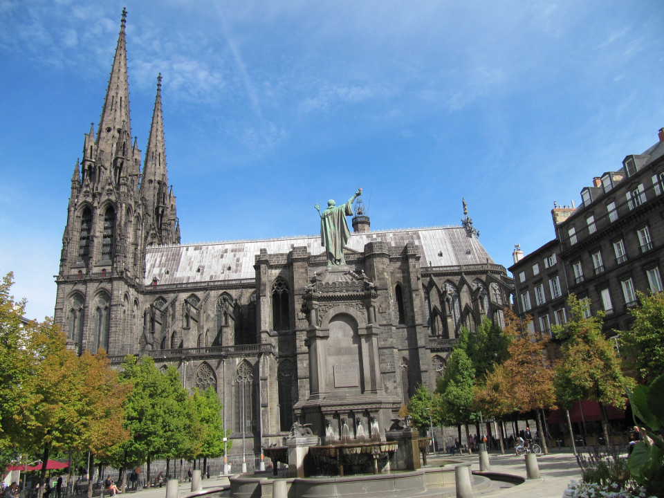 Elle est construite à partir de 1248 par l’évêque de Clermont, Hugues de La Tour. Jean Deschamps le maître d’œuvre délaisse l’arkose pour se tourner vers la pierre volcanique issue des coulées de lave du puy de la Nugère à Volvic. Par ce choix fondamental, il façonne pour toujours l’image de la ville et des villages alentours. La cathédrale, restée inachevée pendant plus de cinq siècles, acquiert sa silhouette si reconnaissable grâce à l’architecte Eugène Viollet-le-Duc qui la dote d’une façade harmonique et de deux flèches. Ainsi, l’édifice devient un condensé du style gothique et néogothique autant par son architecture que par ses décors intérieurs et son mobilier. La cathédrale présente une prestigieuse collection de vitraux médiévaux.