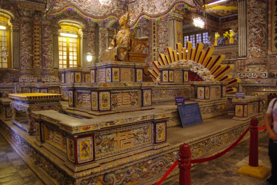 Réveil matinal pour une journée consacrée à visiter les principaux monuments de HUE, ce matin il pleut et nous entamons notre programme par la découverte de l’ancienne cité impériale HOANG TRANH ; réservée à la famille royale celle-ci a été édifié en 1804 de plan rectangulaire (606m / 622m) elle comporte 4 portes (porte de la vertu, de la paix de l’humanité, du midi), ce fut la demeure des Empereurs Nguyen. Sa conception fut inspirée par la cité interdite de Pékin .L’enceinte jaune, couleur impériale, est percée de portes richement décorées, l’une surmontée du belvédère des cinq phénix couverte de tuiles vertes .poursuite jusqu’aux tombeaux des empereurs MINH MANG, et KHAI DINH. Celui de Minh Mang est situé dans un cadre de paisibles jardins et d’étangs ; celui de Khai Dinh arbore un style unique mêlant architecture vietnamienne traditionnelle et style occidentale..