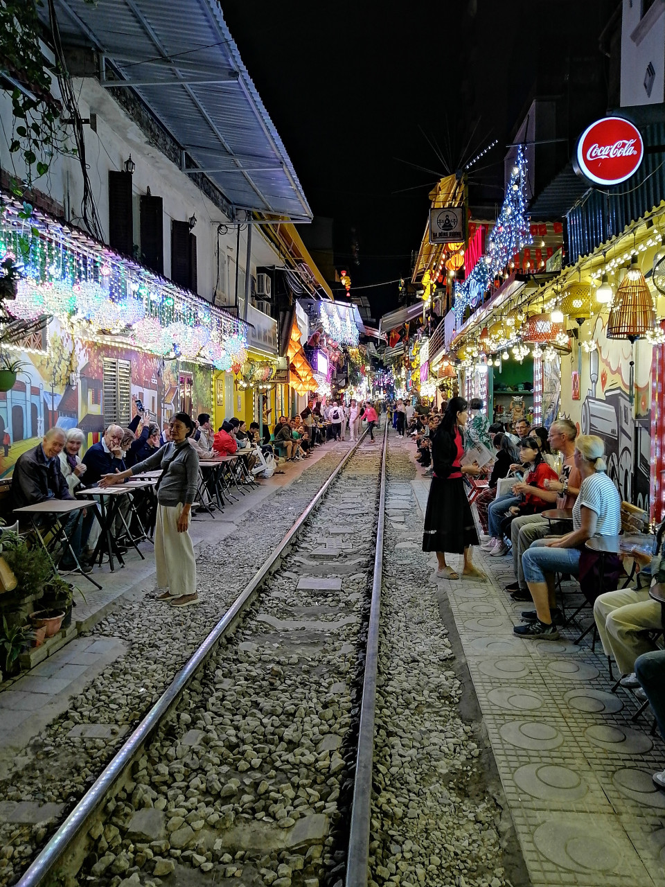 Après le repas j’emmènerai les volontaires dans un endroit le plus surprenant et atypique de Hanoi. Une voie ferrée traverse un quartier très populaire, de chaque côté de la voie des bar ou sont disposés à l’extérieur de petite tables, on s’y assoit pour consommer et lorsqu’un train est annoncé le patron retire les tables , nous serrons nos chaises contre le mur , une ligne matérialisé sur le sol nous donne la distance à ne pas dépasser et le train défile à 10cm de nos genoux, il ne faut surtout pas bouger et le temps parait bien long avant que le dernier wagon ait disparu.