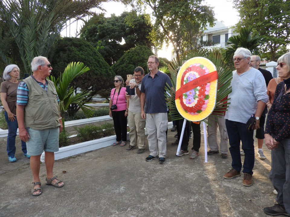 Vers 9h nous partons pour une visite du PC du général Giap situé à une vingtaine de kilomètre c’est un site remarquablement conservé, sur la route du retour nous faisons une halte dans un village Thai noir à la rencontre des habitants. De retour à DBP pour le repas nous allons continuer nos découvertes par la visite de la célèbre colline Éliane 2 qui elle aussi se situe maintenant au centre-ville. Nous nous rendons ensuite au cimetière militaire Vietnamien afin d’y déposer une gerbe par 2 Arpètes Philippe BENOIT P78 et Jean Jacques ROCLE P59 puis au monument français ou Michel WIDMER P 47 et Jean Michel ALEXANDRE P 84 déposeront eux aussi une gerbe, nous constatons que le monument est parfaitement entretenu, la plaque que j’avais déposé en 2004 est encore en excellent état. Pour cette commémoration nous nous recueillons en écoutant le concerto de l’adieu, musique composé par Georges Delerue pour le film de Pierre Schoendoerffer « Dien Bien Phu ».