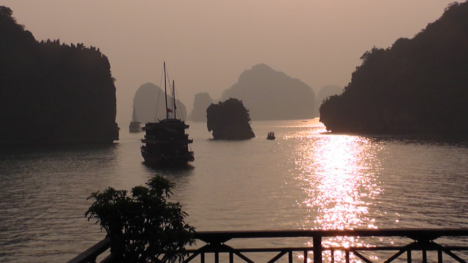 Départ ce matin pour la baie d’Along, après 3h de route nous embarquons sur une petite jonque qui va nous conduire vers le bateau ou nous passerons la nuit. Après présentation de l’équipage nous rejoignons nos chambres avant de prendre un succulent repas. L’après-midi nous embarquons sur des petites pirogues qui vont nous permettre de visiter la baie d’Along, véritable merveille connue dans le monde entier. Ses paysages sont exceptionnels avec ses géants de pierres qui émergent des eaux transparentes. De retour au bateau nous profitons de la température encore clémente pour nous jeter à l’eau. La nuit tombant rapidement c’est sur le pont avec un copieux apéritif que nous patientons avant le diner. Après le repas nous en profitons pour admirer dans le plus grand silence le merveilleux paysage qui nous entoure.