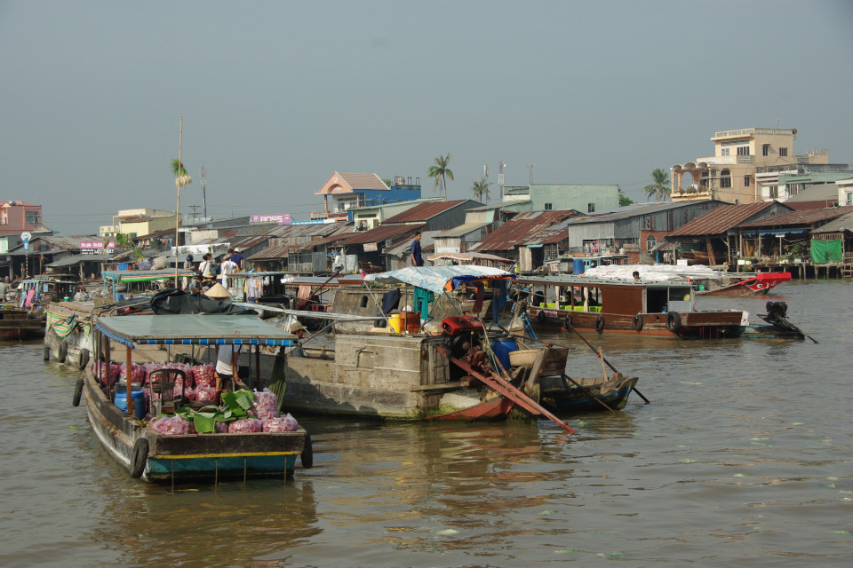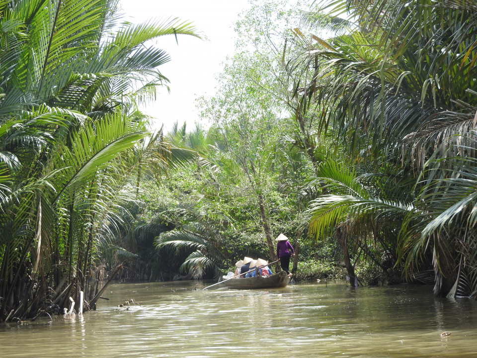 Départ pour une promenade matinale en bateau sur le Mékong et ses canaux, ce qui nous permet d’admirer des paysages de rizières, de hautes herbes ainsi que de nombreux vergers plantés d’aréquiers, de cocotiers d’orangers et de mangoustaniers. Découverte d’un autre monde, la vie du delta avec ses marchés flottants, ses maisons flottantes et sur pilotis, le tout au milieu d’une végétation luxuriante. Des embarcations de toute sorte sillonnent nonchalamment une infinité de canaux.