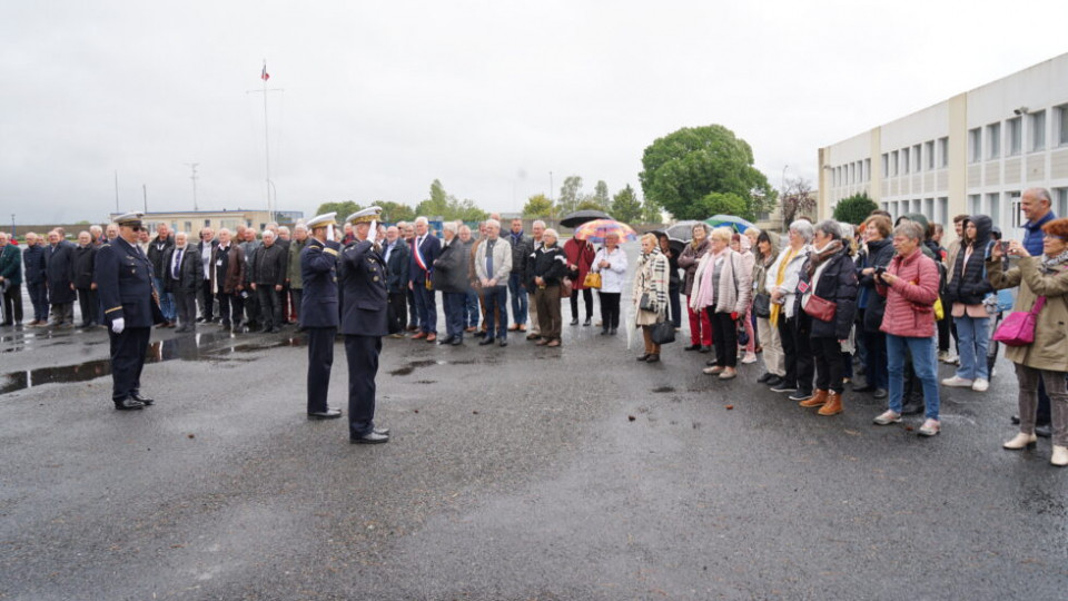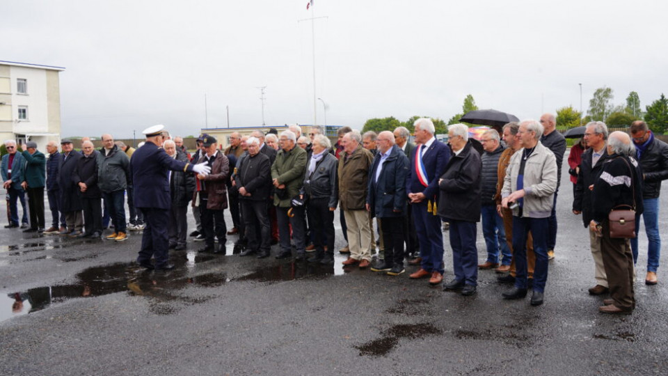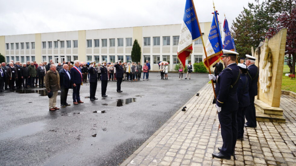 Nous nous dirigeons ensuite sur la place d’armes (sous la pluie) où une gerbe est déposée au bas de la stèle en l’honneur à nos camarades disparus par nos représentants, Bernard DUVIGNEAU, entouré de Gérard LENOC ex président de l’AETA et de Gérard CORGNAC ceint de son écharpe de maire de Cléry St André près d’Orléans ; une autre gerbe est déposée par le colonel BLEUNVEN Commandant la base et une marseillaise « à capelle » est chantée par toute l’assistance avec toute l’émotion ressentie. Jules dans sa belle tenue militaire est l’un des portes drapeaux.