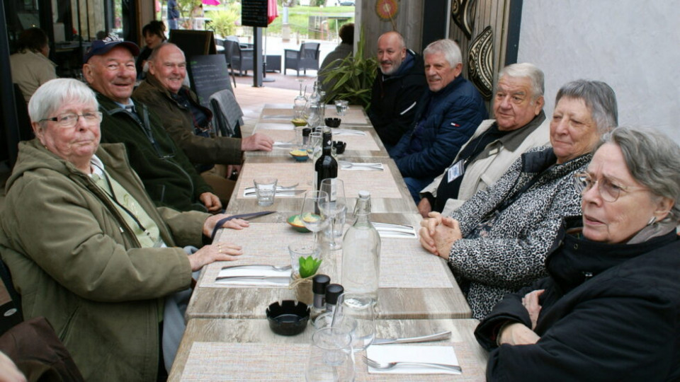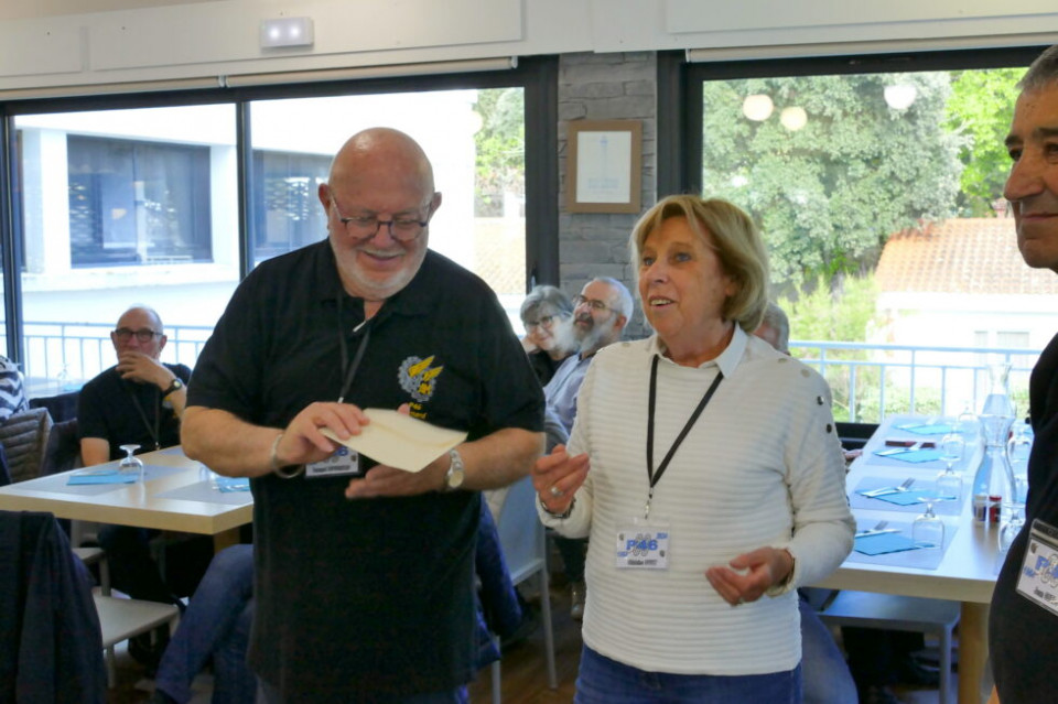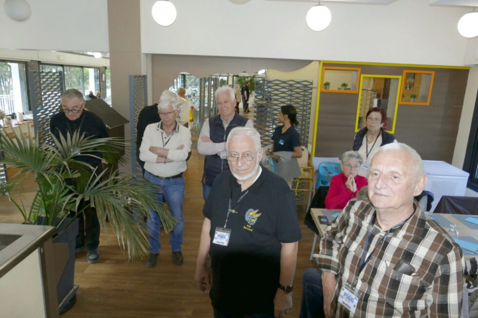 De retour à l’Igesa nous partons à 18h30, toujours avec notre car, pour la soirée à Saintes organisée par la section « AETA Aunis-Saintonge » présidée par Christophe CHOSSENOTTE et après une chanson chantée en karaoké, reprise en chœur par toute l’assemblée avec des paroles rappelant notre vie d’arpète à Saintes deux surprises nous attendent ; le père JUHEL 94 ans bien connu par tous et qui prenant la parole avec beaucoup de verve, nous a narré quelques épisodes et anecdotes bien croustillantes de sa vie dont une est son arrivée en autostop et en moto sur la base !!; notre instructeur en électricité l’A/C NORDET et je ne sais pas quels étaient les plus émus entre lui et les camarades qui l’ont eu comme enseignant.