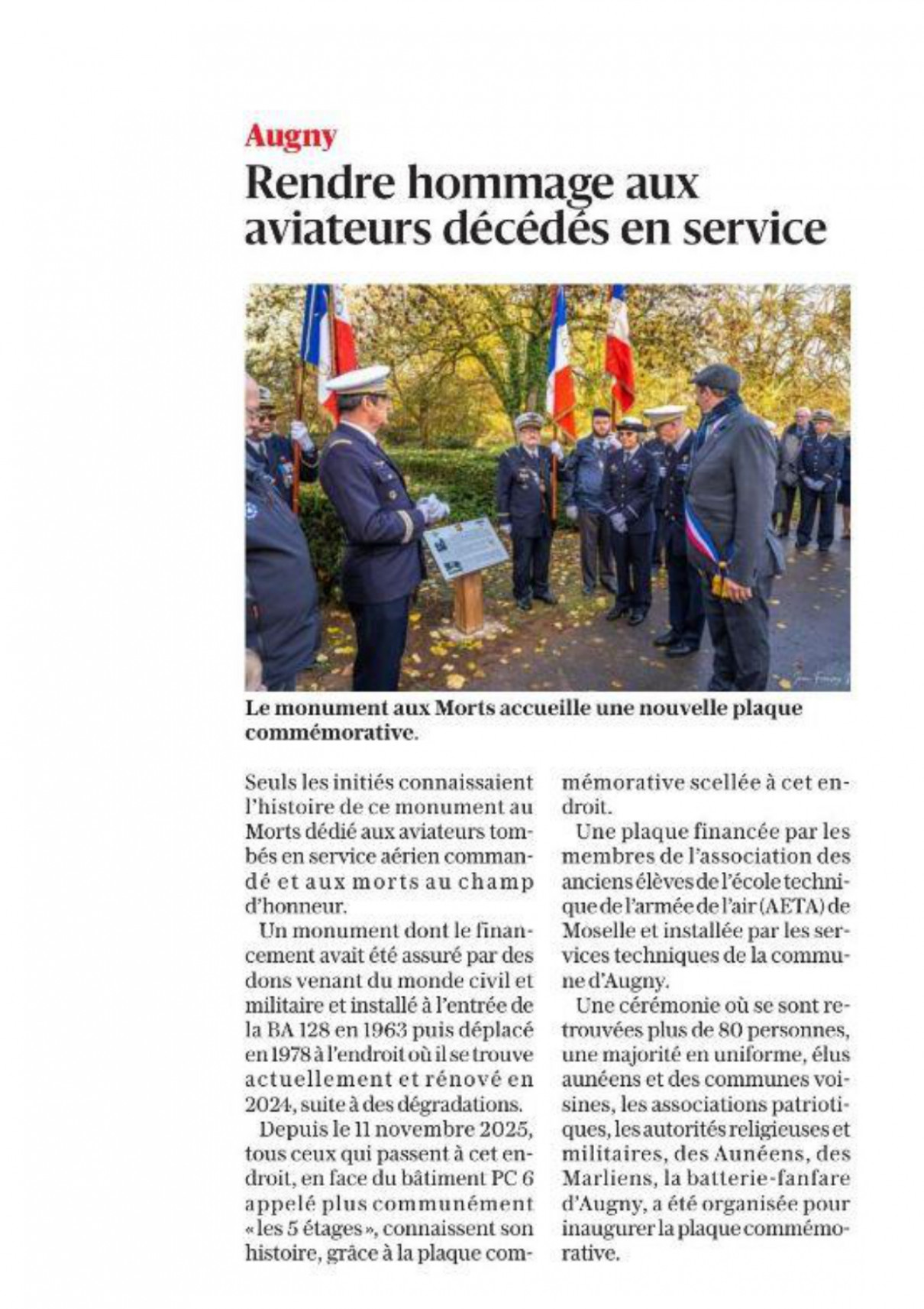 Lors de la cérémonie du 11 novembre 2025 sur l'ancienne base aérienne de Metz Frescaty fut inaugurée une plaque commémorative financée par des arpètes de la section Lorraine.